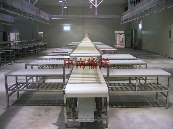 分割輸送機又稱不銹鋼尼龍輸送線,是分割肉流水線生產的主要設備之一。適用于牲畜胴體劈半、預冷、排酸后的剔骨、分割,該機的機架體全部采用不銹鋼材料。輸送帶為無毒尼龍輸送帶,為使經久耐用,采用了無接頭的特制方式,使該機在使用中達到了無噪音,輸送帶無偏斜現象發生,機腳座采用尼龍活動腳,安裝調式輸簡便,機架選料為無縫不銹鋼方管,解決發積垢污染問題。使設備的衛生條件達到了分割車間對外注冊的標準,并使剔骨、分割肉生產輸送自動化。